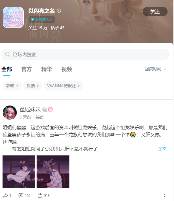 在超话下很多玩家提到了《龙族幻想》。《龙族幻想》是祖龙娱乐研发,腾讯游戏发行的,以虚幻4引擎制作的MMORPG手游。该游戏的美术表现与《以闪亮之名》相似,有玩家认为对于头发的处理两者相差不大。