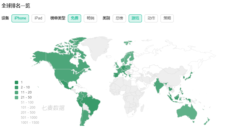 七麦数据显示,《宝可梦:大集结》在36个国家和地区进入了AppStore游戏免费榜TOP50,除了未上架地区的整个美洲,西欧地区乃至《MLBB》的大本营东南亚都在《宝可梦:大集结》的控制范围之内。