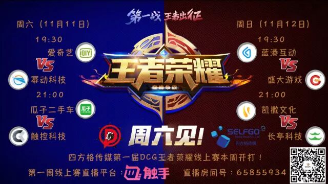 本次DCG将进行为期两个多月的赛程,以当下最火的移动MOBA游戏《王者荣耀》为主比赛项目。从海选阶段按16支队伍,分成A-D四组,每组四只队伍,进行小组单循环比赛BO3,共24场正赛,在决出四强前皆为线上赛。时间为2017年11月到12月两个月 6个周末共12天。决出四强后,于一月举行线下赛,线上赛四强加上线下特邀四支战队,进行最后的线下总决赛。