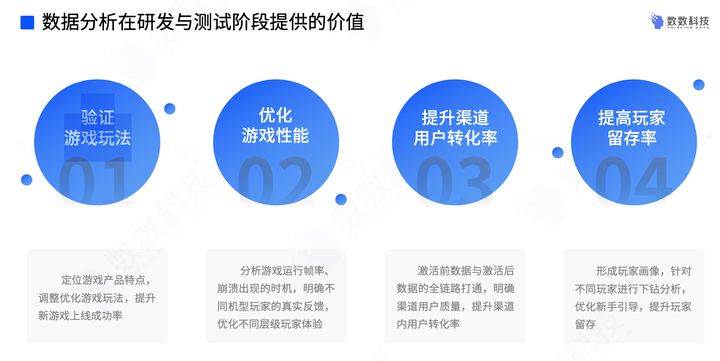 数据分析也在在研发与测试阶段提供了更多价值,帮助游戏验证玩法、优化游戏性能、提升用户渠道转化率、提供玩家留存率等。
