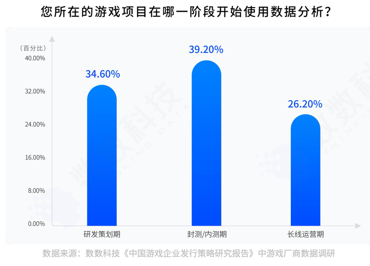 早年间,多数游戏厂商仅在游戏投放与运营阶段开始使用数据分析,近年来,超过 34% 游戏厂商在研发策划阶段已开始使用数据分析,整体呈现出涵盖更广游戏生命周期的趋势。