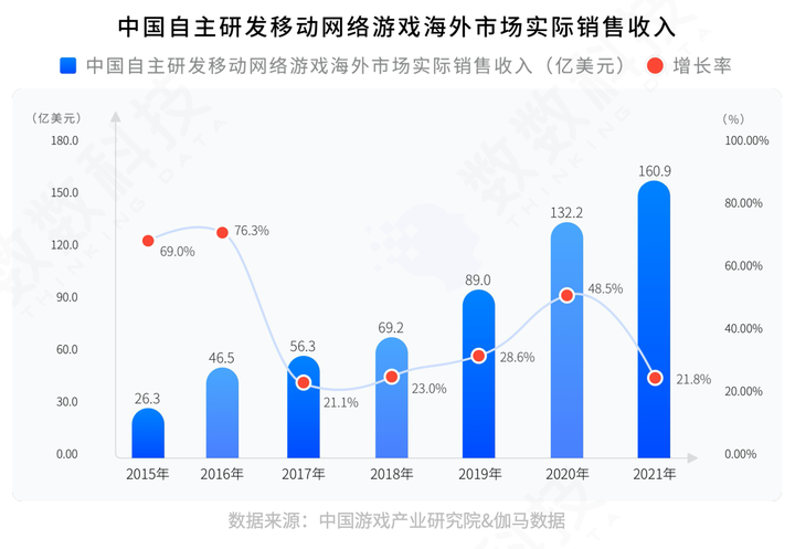 与此同时,中国自研手游在海外市场保持着 20% 以上稳定增速,出海破圈势头强劲,2021 年增长率仍达 21.8%。从下图中可知,近 7 年来中国自研手游在海外持续高速增长,这主要源自于国产游戏的工业化与精品化进程加快,以中国文化元素为主的仙侠、三国等题材游戏受到海外玩家认可。