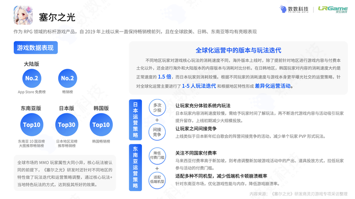 以「塞尔之光」为例,作为 MMORPG 领域的标杆游戏产品,自 2019 年上线以来一直保持畅销榜前列,且在全球欧美、日韩、东南亚等均有亮眼表现。{塞尔之光}研发时针对不同地区的特性做了玩法迭代和运营策略调整,通过核心玩法+ 当地特色玩法的方式,达到投其所好的效果。