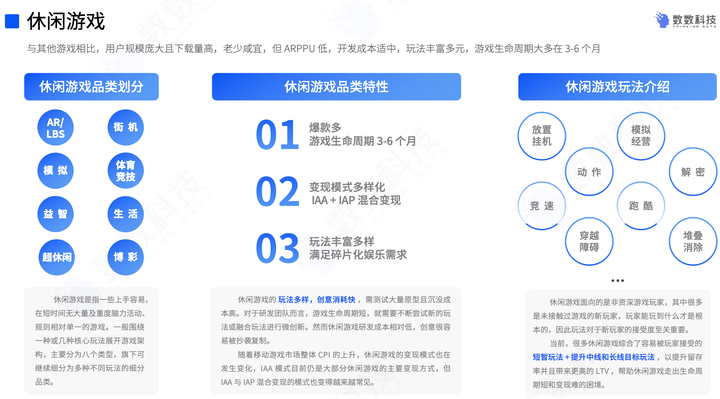 与其他游戏相比,休闲游戏用户规模庞大且下载量高,老少咸宜,但 ARPPU 低,开发成本适中,玩法丰富多元,游戏生命周期大多在 3-6 个月。