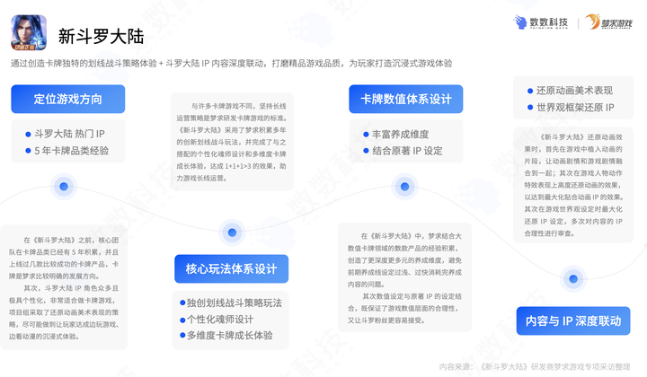 以「新斗罗大陆」为例,这款游戏通过创造卡牌独特的划线战斗策略体验 + 斗罗大陆 IP 内容深度联动,打磨精品游戏品质,为玩家打造沉浸式游戏体验。