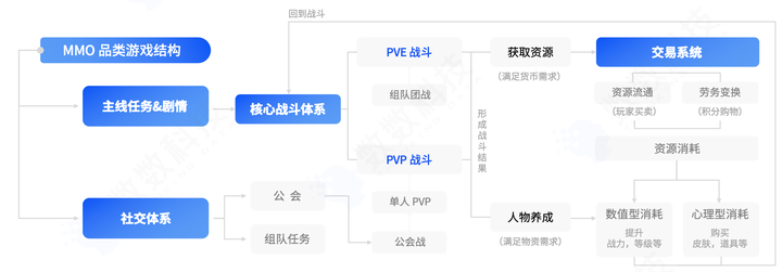 成熟的 MMO 游戏中具备明显的资源流动关系,从开启主线任务开始,逐渐适应游戏内的社交体系并进入战斗,得到战斗结果后获取资源,进入游戏内的经济体系兑换与消耗资源,然后再次进入战斗,是一种资源不断循环的过程。区分于其他类别的游戏,最值得一提的也是不能忽略的部分,就是 MMO 游戏中存在交易机制,交易机制是关乎游戏平衡性的重要模块,也是把控游戏核心循环的关键。