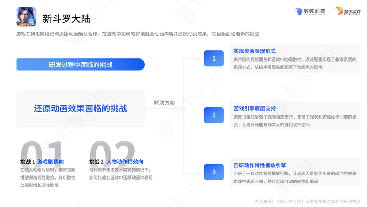 在如何解决与 IP 内容深度联动方面,「新斗罗大陆」也提供了更多经验。首先,将多片段的视频播放和游戏中动画融合,通过配置实现了非常灵活的表现方式,从技术层面高度还原了动画片的剧情。其次,游戏引擎底层做了视频播放支持,支持了视频和游戏动作引擎的结合,让设计师能有非常大的自由发挥空间。最后,通过自研的一套动作特效播放引擎,让动画人员制作出来的动作特效和游戏中表现一致,并且实现自动的转换和编译。