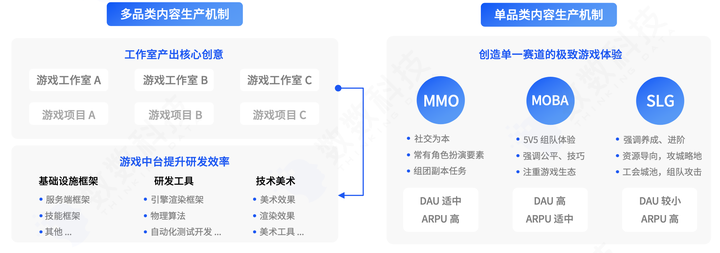 头部大厂大多已从研发代理向自研自发转变,且以综合性内容生产机制为主,通过游戏中台机制快速支持不同项目的研发需求。如腾讯旗下四大工作室齐发,通过赛马机制完成内部竞争,并通过中台快速支持不同项目效率提升。网易则对新项目不确定性的包容度更高,在非强势品类中也有很多创新尝试,并借助中台提升整体研发效率。