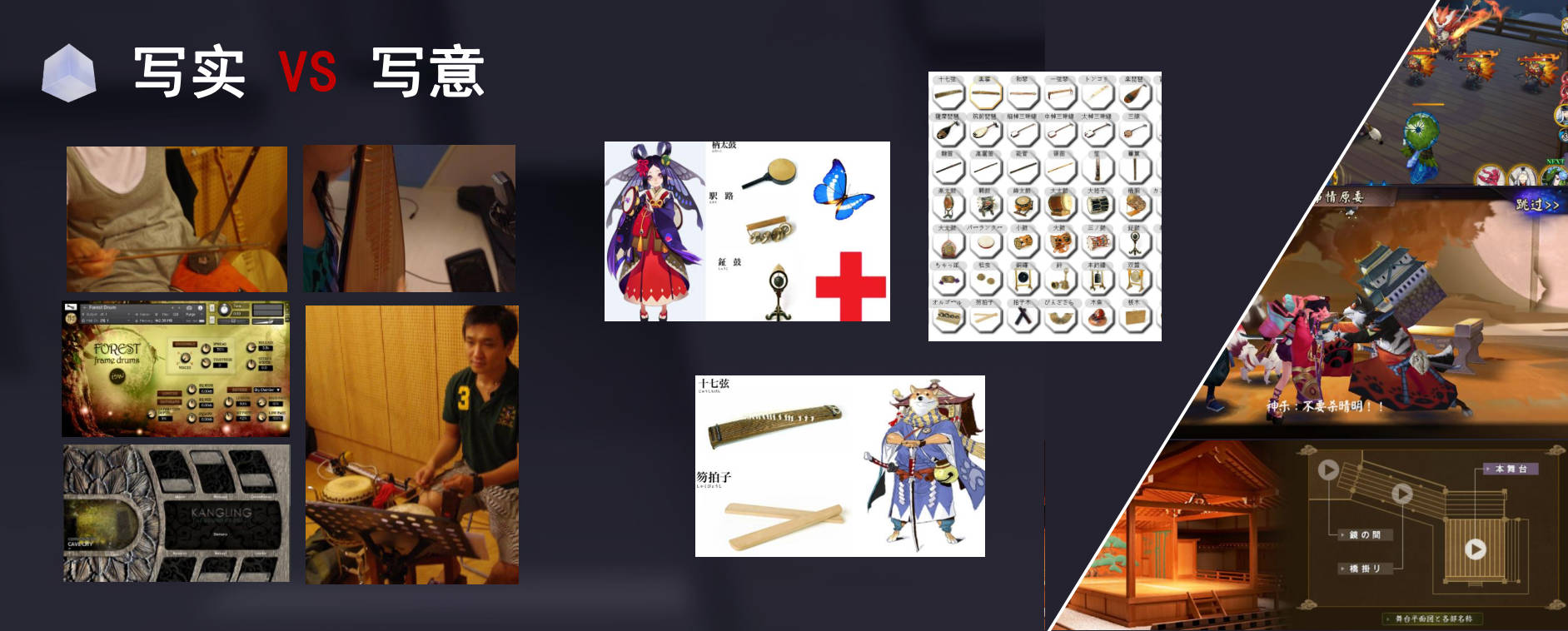 这边举一个例子,就以阴阳师来说,我们在阴阳师设计的初期,我们打算是打造一个极度风格化的游戏,因此我们从写实的追求开始转往写意的追求。不论是式神、角色、场景的设计,我们都更在意它背后的设定是什么、它背后的故事是什么、它想传达给玩家的感受是什么。因此我们透过了对很多日本传统乐器的拟音、录制、重新取样,融合到音效当中,甚至融合到场音当中。