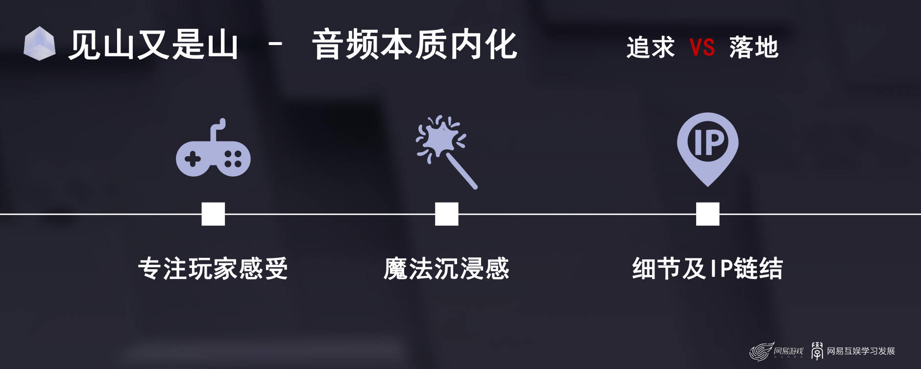 追求以及落地。那追求是什么呢?在这款游戏当中我们追求三点:第一个是专注玩家的感受;第二个则是很强烈的魔法沉浸感;第三个则是游戏中的细节及IP。我们更重视在这款游戏当中玩家感受的声音细节。玩家是否感觉到尖叫度?是否有感受到很多彩蛋带给他的喜悦?他是否能在这个场景当中感受到充分的魔法感?他是否能在每一个细节中感受到他跟IP 、听觉跟IP的连接?