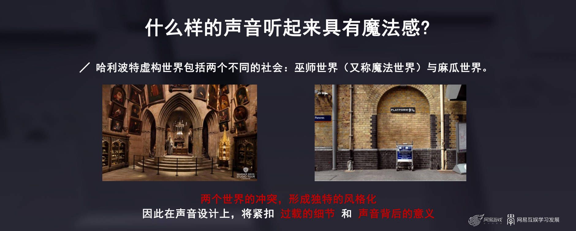 那针对魔法感的部分我认为是最值得探讨的,也就是说什么样的声音听起来是具有魔法感呢?实际上在哈利波特的世界里,是透过现实跟虚拟的冲突来去打造它的魔法感的,也就是说如果我整个游戏都是充满了魔法类音效,其实你并不会觉得这个游戏是充满魔法感的。因此现实的声音反而是打造魔法感的一个关键,也就是说我们必须透过现实声音过载的细节,以及赋予每个声音背后的意义来去让两者之间造成一种听觉冲突。