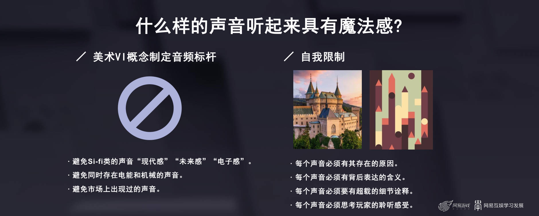 我们同时做了四个自我限制,这是对于我们自身的思考,也就是说我在制作每一个音频的时候要自己问自己:首先这个声音是不是有其背后存在的原因?再来这个声音它背后代表的含义究竟是什么?这个声音它是否有超载的细节跟内容?这个声音是否是站在玩家的角度去思考这个声音是否能带给玩家什么?这是我们做的4点自我限制。