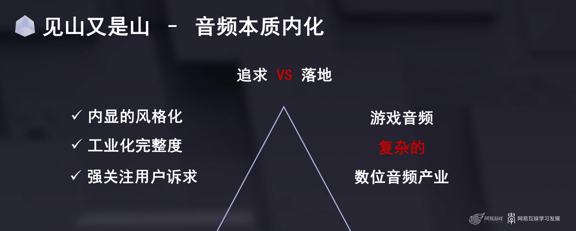 我们从游戏的风格化一直到对于本质的追求,最后到工业化的落地,其实这个旅程当中我们理解游戏音频实际上它并不是独立存在的,也就是当我们手游音频往3A的方向走的时候,我发现实际上游戏音频最重要的是音频与游戏之间的关联、与用户之间的关联,因此用户导向则是决定音频质量的关键因素。