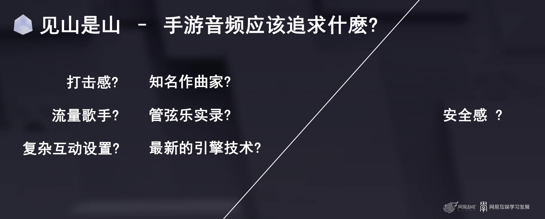 我认为,一开始是一个“见山是山”的过程。什么意思呢?打造一款手游音频,我们一开始探究的问题,肯定是手游音频应该追求的是什么?