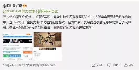 比如10月24日,国产STG游戏《愤怒军团》的开发商惊叫盒游戏发布了一条微博,该微博控诉3DM发布了《愤怒军团》的破解版,并要求3DM下架并删除盗版资源。