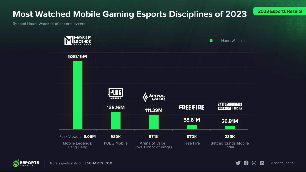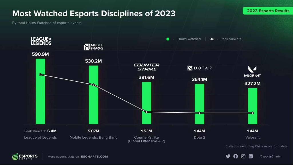 据第三方权威数据网站Esports Charts统计,在2023年全球电竞赛事热度榜单中,决胜巅峰位居全球电竞赛事第2。M5世界总决赛以506万的峰值观赛人数,成为2023年度全球移动电竞赛事第1。