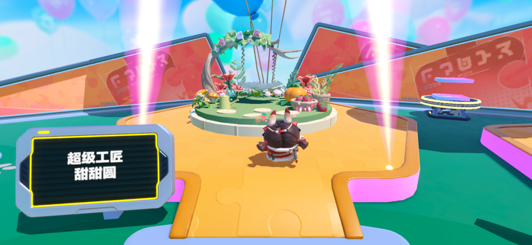 通过传送门进入到「乐园嘉年华分岛」之后,周遭的一切都变得梦幻了起来。我路过广场中心的蛋仔雕塑之后,首先被超级工匠「甜甜圆」的展台所吸引,鲜花环绕,青翠欲滴,像是把对生活所有的美好寓意都浓缩了进去,形成对过去一年的情感回溯。