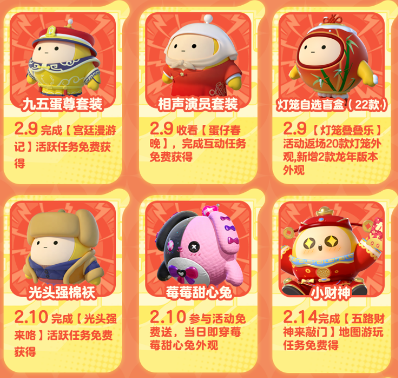 此外,整个蛋仔岛也将增添更多体现春节传统习俗的互动玩法,比如说玩家在主城撞击龙龙沾沾福气,就可以获得龙龙发来的红包;还可以在广场上寻找随机刷新的、大小各异的鸿运福猪,与蛋搭子合力举起,保佑“猪”事顺利;抑或是去庄园当中的贝壳池摸鱼,摸出锦鲤宝箱,从而获得丰厚奖励……