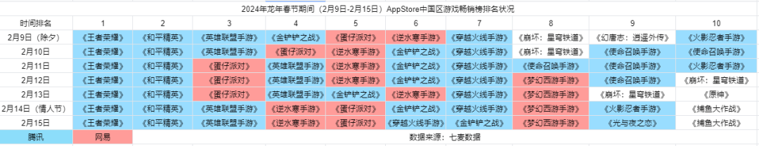 市场观察时间选取了2月9日(除夕)至2月15日一周时间,即春节期间人们比较集中的休闲时段。数据来自七麦数据和广大大。