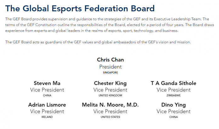 据介绍,GEF是一个国际电子竞技管理机构,于2019年12月成立,总部位于新加坡。GEF由154个成员联合会和四个洲电竞发展联合会(非洲、欧洲、大洋洲和泛美洲)组成。首任及现任主席为曾成兴(Chris Chan)(新加坡)(新加坡奥委会秘书长),首席执行官为Paul J. Foster(澳大利亚)(曾任国际奥委会顾问),除应书岭外,担任副主席的成员还有:马晓轶(中国)(腾讯集团高级副总裁)、Chester King(英国)(英国电子竞技联合会主席)、T A Ganda Sithole(津巴布韦)(曾任国际奥委会国际合作发展部主任、津巴布韦奥委会主席)、Adrian Lismore(爱尔兰)和Melita N. Moore, M.D.(美国),此外,沙特电竞协会主席、Savvy董事会副主席、沙特费萨尔王子也在GEF中担任名誉董事会成员。