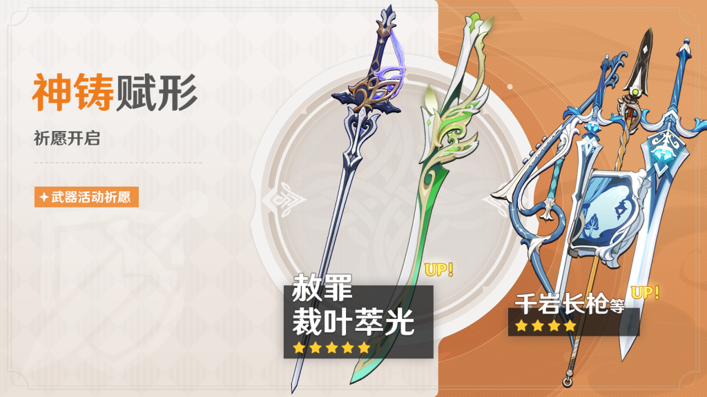 除此之外,「神铸赋形」活动祈愿也已开启,全新限定五星武器「单手剑·赦罪」、限定五星武器「单手剑·裁叶萃光」将迎来概率UP!