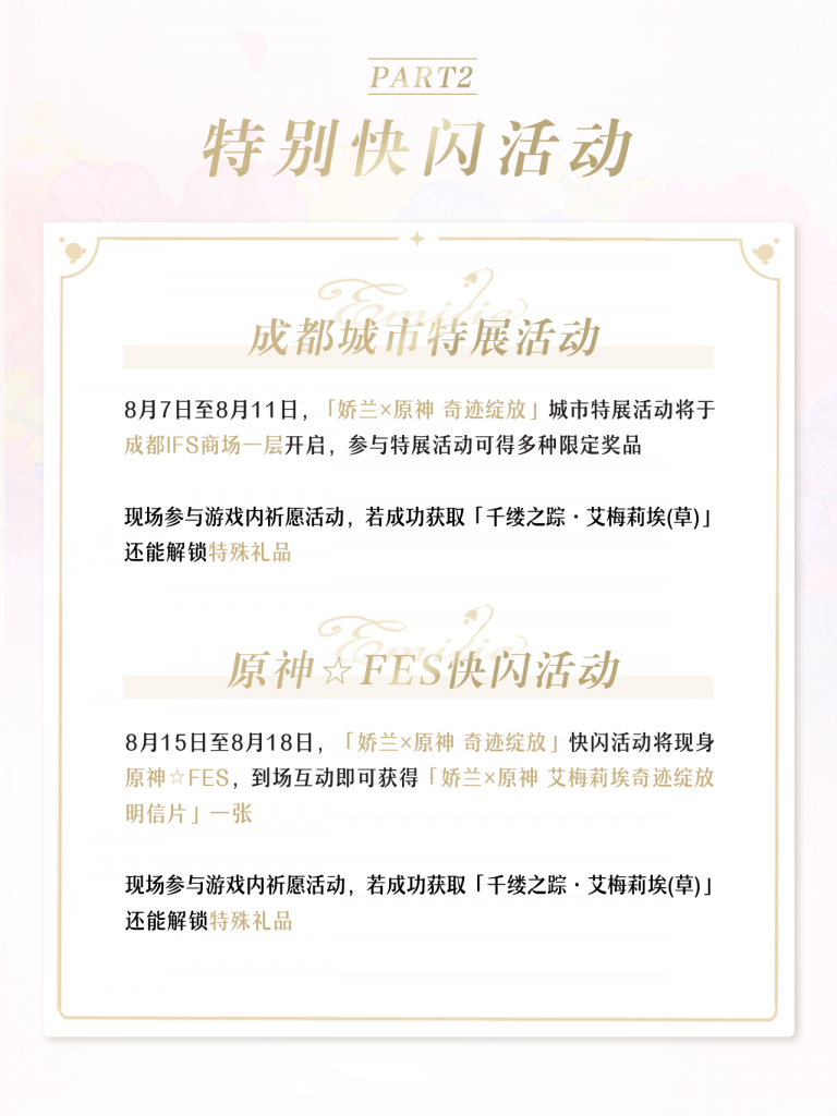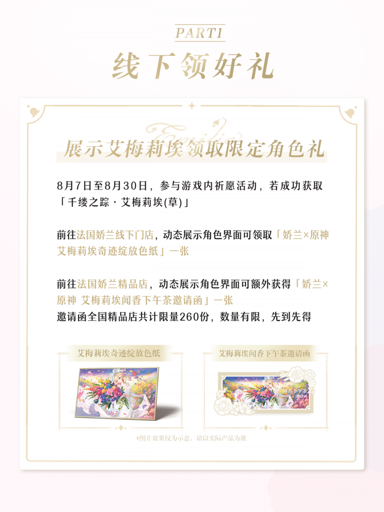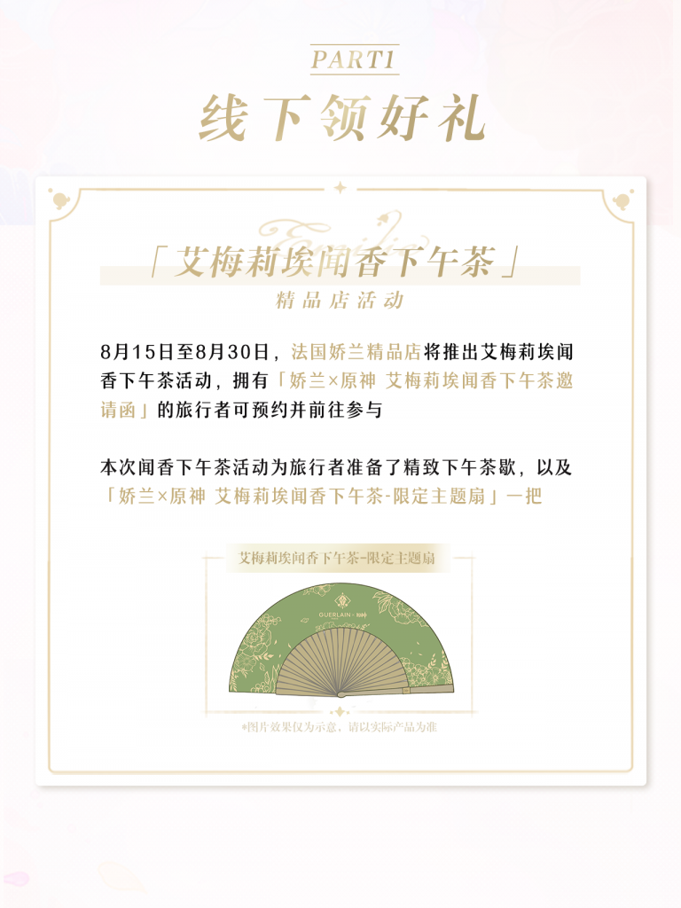 若玩家前往娇兰精品店,还能额外领取「娇兰×原神 艾梅莉埃闻香下午茶邀请函」一张,名额有限先到先得!