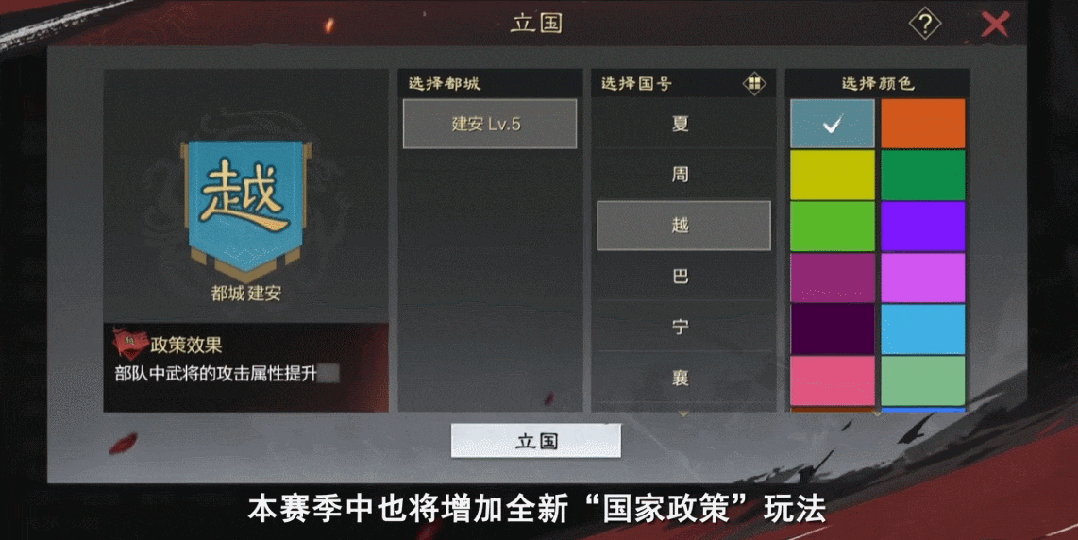 而后,夷陵之战开始时,魏、蜀实际上都已建国称帝,因此在“决战夷陵”当中也顺应历史,加入了全新的“国家政策”系统,通过选择不同的国号,就会获得不同的增益buff,这不仅能带来建立国家的成就感,在策略层面上也同样很值得探索!