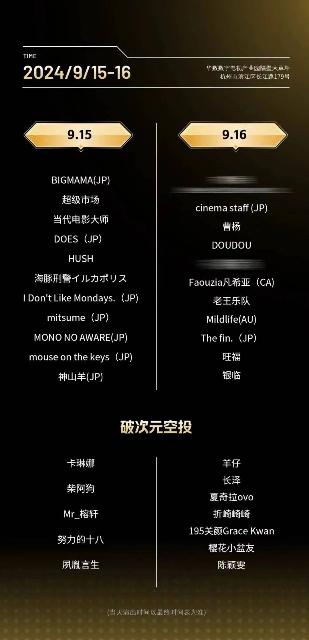 随着9 月16 日破次元空投嘉宾的揭晓,我对这场跨界的艺术盛典也更加期待了。每位嘉宾都将以其独特的风格,为观众带来视听盛宴,你更期待哪天的嘉宾阵容,想在哪天和大家见面呢?就让我们锁定9 月的杭州,共同见证这场音乐的跨界融合吧!