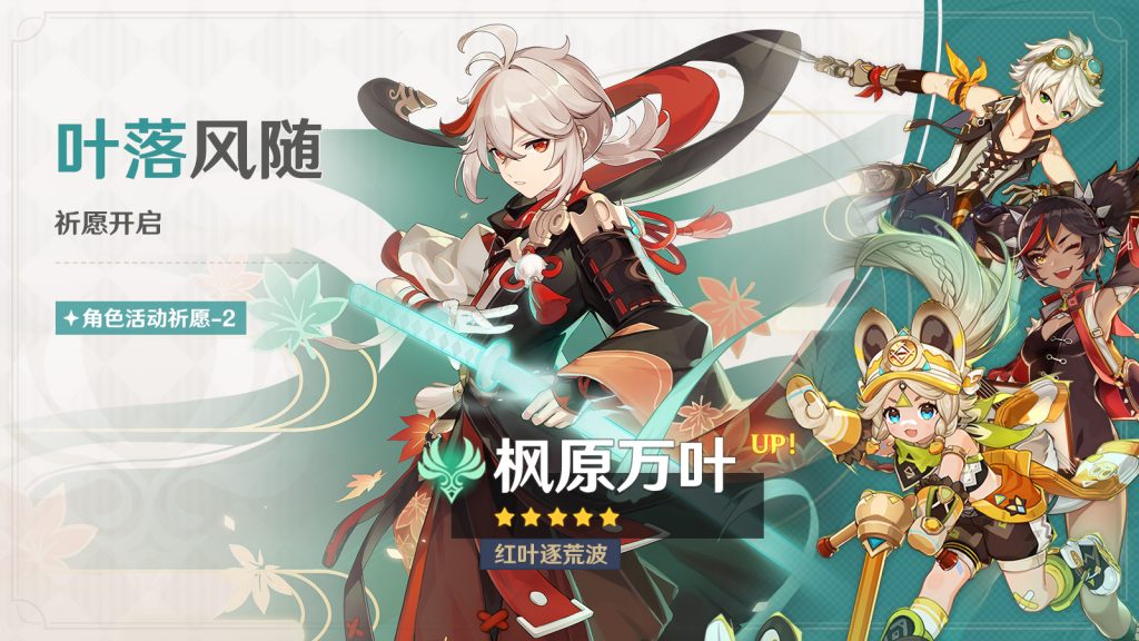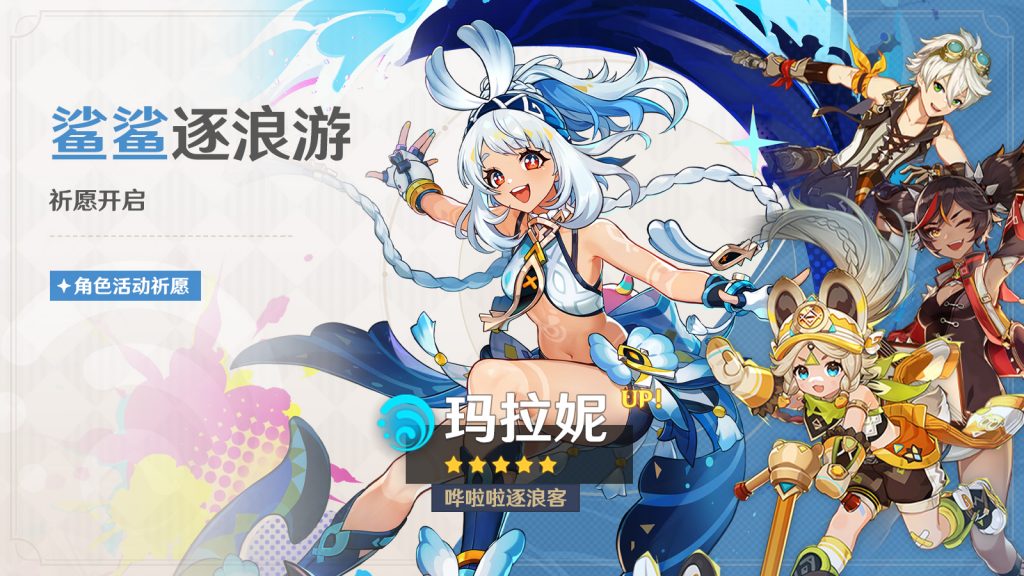 5.0版本更新后至2024年9月17日17:59,角色活动祈愿「鲨鲨逐浪游」与角色活动祈愿-2「叶随风落」开启,全新限定五星角色「哗啦啦逐浪客·玛拉妮(水)」、限定五星角色「红叶逐荒波·枫原万叶(风)」与全新四星角色「斑金矿朴·卡齐娜(岩)」分别迎来概率UP。