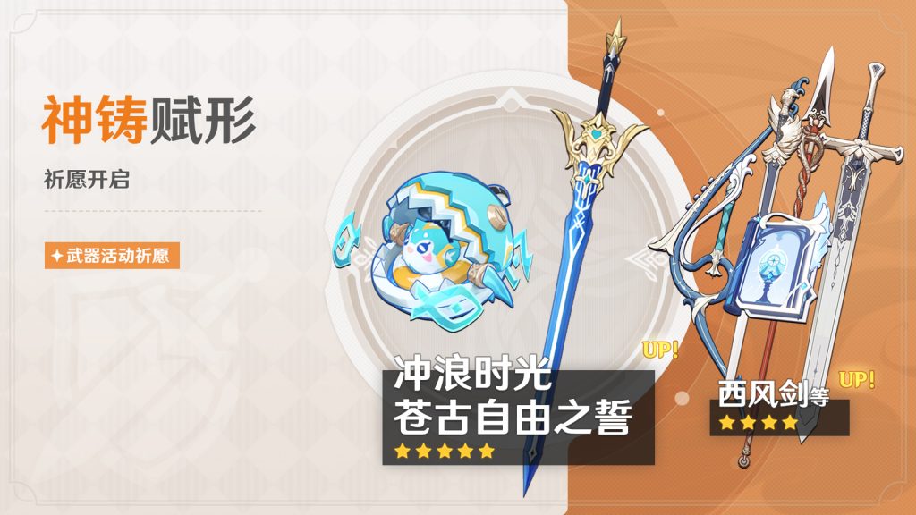 除此之外,「神铸赋形」活动祈愿也已开启,全新限定五星法器「冲浪时光」和限定五星单手剑「苍古自由之誓」将迎来概率UP!