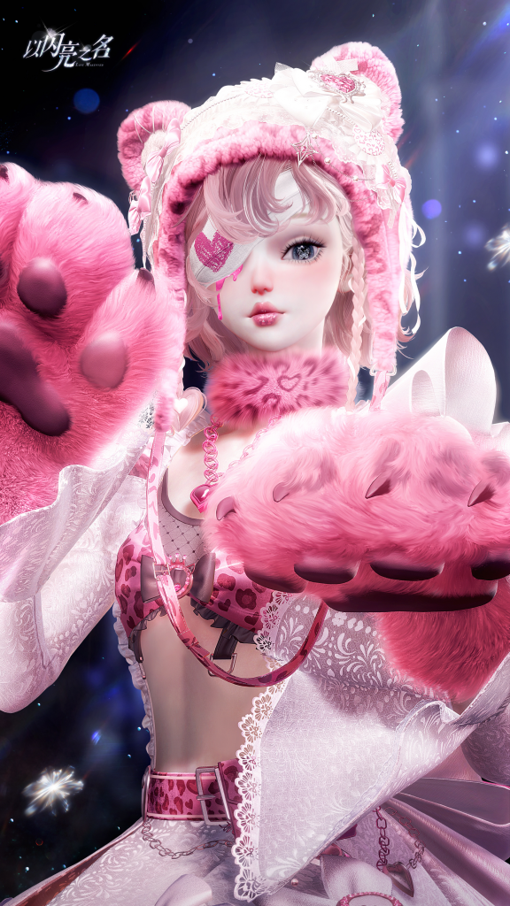 如果说噤声夜谭五星套装像是一个循规蹈矩的乖巧萝莉,那么《以闪亮之名》囚梦夜语版本的另外一套蜜色蚀心五星时装则更有戏剧张力,更像是一个更俏皮鬼灵精怪的角色。蜜色蚀心五星套装整体以粉色作为主色调,实际上是以“粉红豹”作为设计灵感,在粉色娇嫩俏皮的整体氛围中,增加了豹纹元素带来的反差力量感,也让这套时装的游戏感知更加独特。