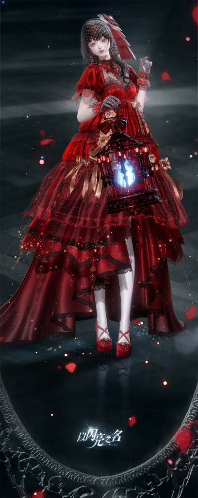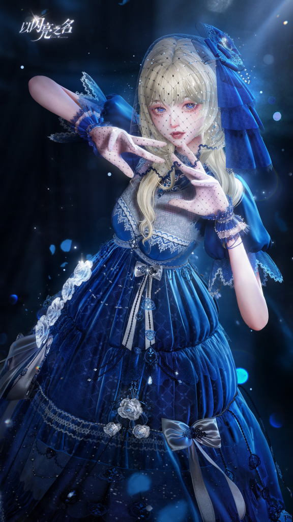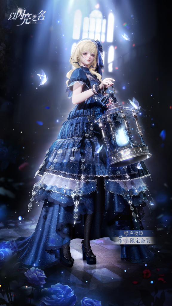 不仅如此,噤声夜谭五星套装的裙身上也增加了大量玫瑰与金属质感的饰品,闪片和半透的薄纱在光线的照射下宛如星辰与月光的共舞,散发着奢华的光芒,多层蕾丝花边的细腻堆叠,如同花瓣的温柔相拥,更加呼应了以蓝色玫瑰为概念的整体设计。