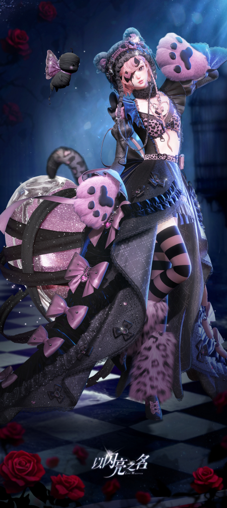 同样是采用了洛丽塔风格的部分裙摆元素,但蜜色蚀心五星套装也增加了更多的时尚和时装元素,裙摆前侧保持了短裙的干练,也能更好地展现出红白相间的袜子带来的搭配效果,后摆则是通过更加夸张的加长版燕尾拖尾让这套时装的动感更强,也更符合“粉红豹”带来的直观感受。两侧的粉色飘带、粉色的豹爪和毛茸茸的头饰,小腿上的粉色半点豹纹,都在宣告着这个可爱粉色角色的“杀伤力”。