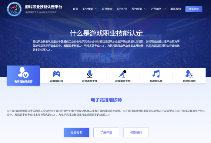 游戏职业技能认定考试平台是针对游戏相关从业者开展的技能认定项目,有需要的人员可登录游戏职业技能认定考试平台(http://www.chinesc.org.cn)报名考试。目前,已经开设了电子竞技陪练师、游戏陪玩师、游戏语音主播、游戏语音主持、游戏音乐师、游戏指导师6个职业技能考试项目。每个职业技能考试,都有对应的团体标准,通过理论考试和实操考核后即可获得相应的技能认定证书。