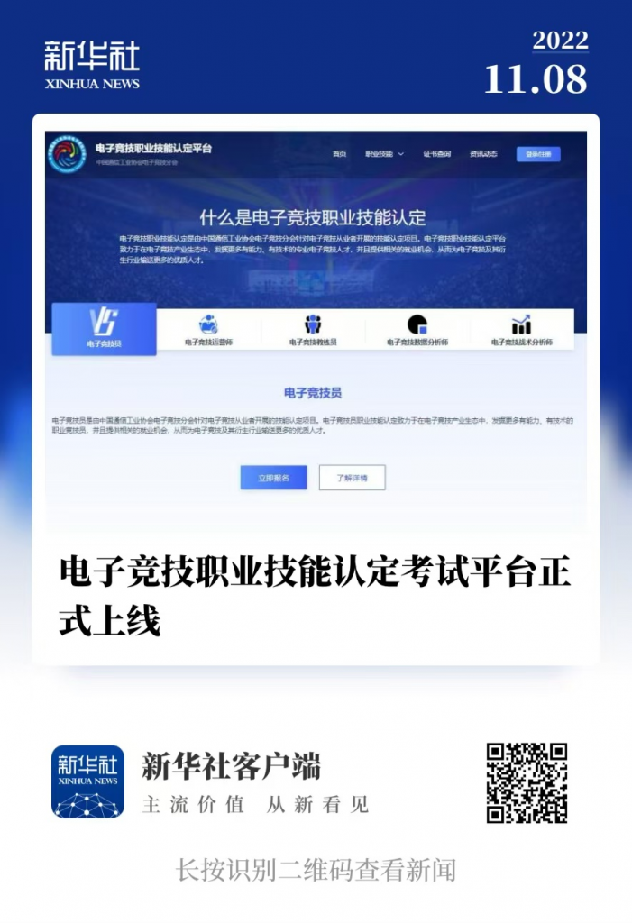 11月1日,由中国通信工业协会电子竞技分会指导开发的游戏职业技能认定考试平台正式上线。