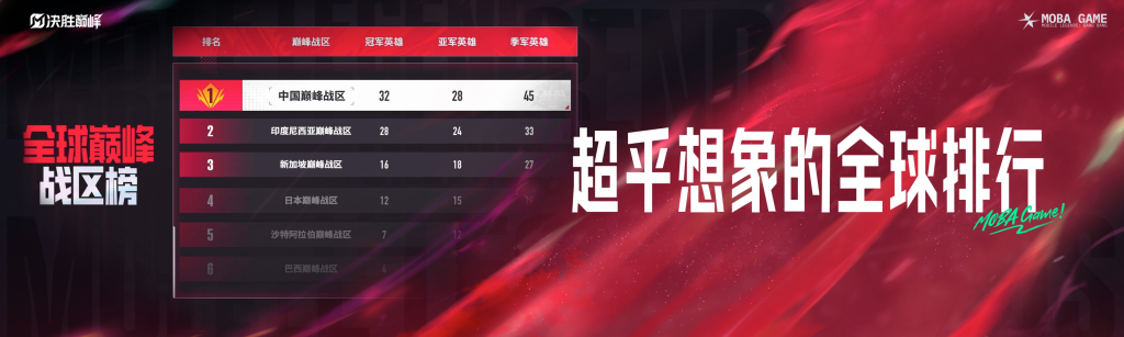 全球英雄排行榜也将在公测期正式上线,给中国玩家一个在全球展示实力的平台。中国玩家目标将不再局限于国内赛场,全球第一成为新追求。为了鼓励玩家参与,官方宣布首位登顶“全球英雄排行榜”的中国玩家将获得由《决胜巅峰》项目组送出的特别订制奖牌,象征着中国玩家在全球电竞舞台崭露头角。