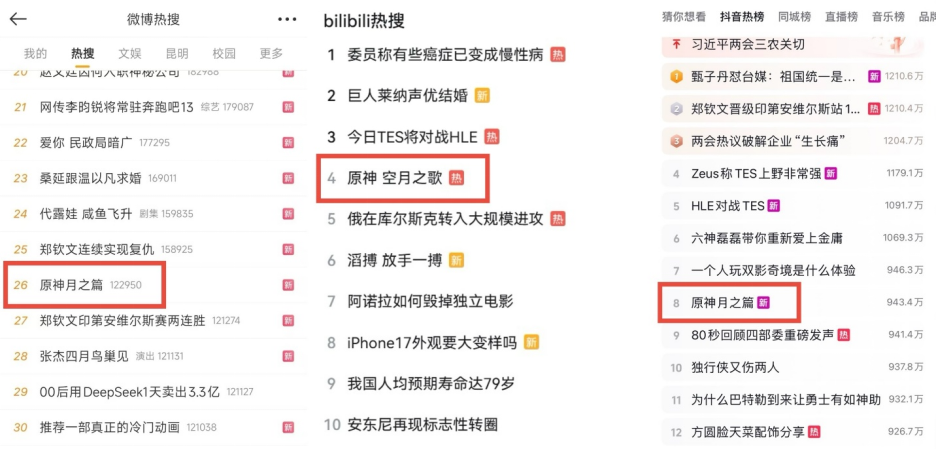 此前在3月10日,《原神》官方发布“空月之歌”网页,玩家围绕“月神”、“三月”等概念展开广泛讨论,#原神月之篇#相关话题登上多平台热搜。