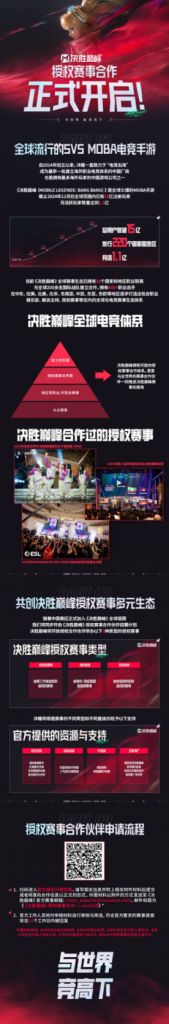 随着中国赛区正式融入《决胜巅峰》全球版图,赛事官方开启了授权赛事合作伙伴招募计划。官方开放了商业性赛事、高校赛事、政府赛事三种授权赛事类型。第三方商业机构、高校或高校联盟、各级政府机构均可申请。沐瞳作为赛事官方,将根据赛事类型和量级,提供技术支持、战队资源、IP资源以及宣发推广等全方位的支持。