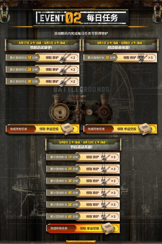 活动2:每日任务,活动期间完成每日的游戏时长任务可获得活动道具铁铲,完成全部每日任务还可领取幸运空投!请玩家们注意,每日任务分成了三个时间周期,每个时间周期需要完成的时长任务是不一样的。