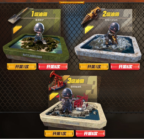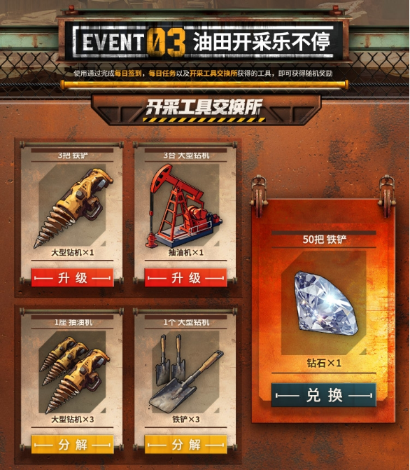 活动3:油田开采乐不停!通过每日签到和每日任务获得的铁铲可在开采油田玩法中使用,铁铲不仅可以直接开采1级油田,还可以在开采工具交换所中升级成大型开采设备,2级油田需要大型钻机,3级油田需要抽油机,一定要合理使用自己的铁铲噢!
