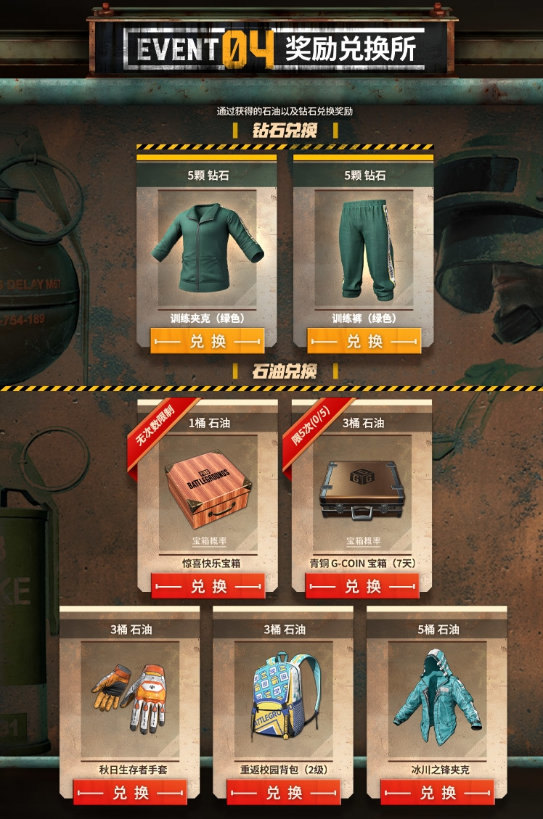 活动4:奖励兑换所!玩家们通过努力开采油田得到的钻石及石油道具可在奖励兑换所中兑换奖励,不仅有G-Coin宝箱,还有首次全新公开的训练夹克、训练裤等皮肤道具可供兑换!