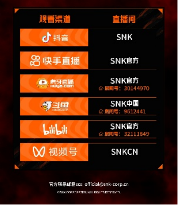 直播平台:抖音、快手、虎牙、斗鱼、bilibili、视频号平台 @SNK官方直播间