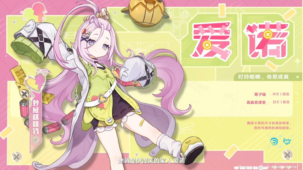 爱诺是首位拥有水元素神之眼的双手剑角色。她能利用随身携带的机关进行战斗,通过元素战技能操纵身后的机械手,快速移动并对敌人造成伤害。她的元素爆发会抛出喷水机关「冷静一下鸭」,间歇性攻击敌人造成水元素伤害。