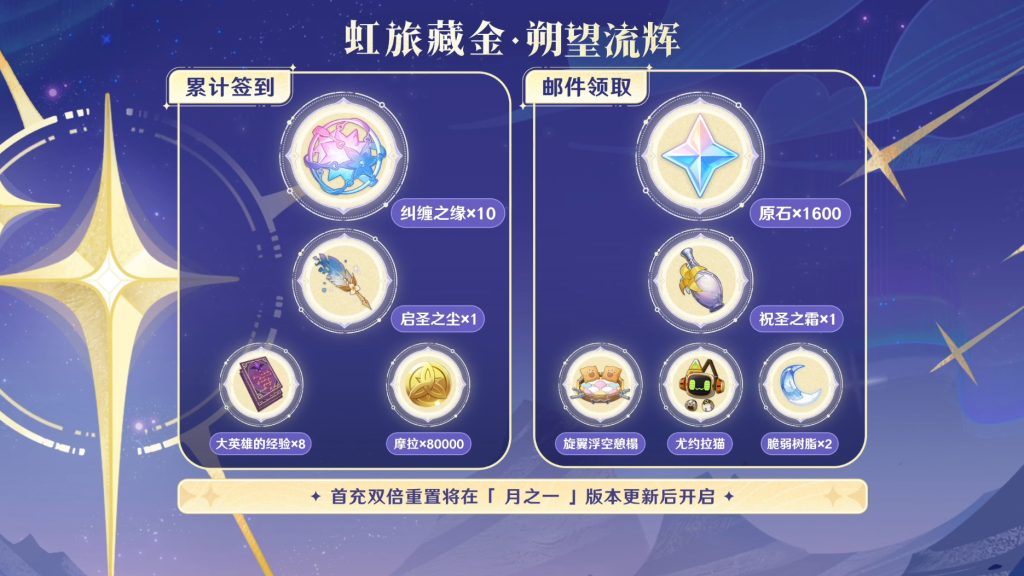周年签到活动将在新版本中开启,旅行者可以通过累计登录,获得最多10枚纠缠之缘以及启圣之尘。与此同时,新版本将通过游戏内邮件形式,提供给旅行者1600原石和多种奖励,包括两个挪德卡莱风格的小道具「旋翼浮空憩榻」和「尤约拉猫」。游戏内商城的首充双倍状态也将会重置。