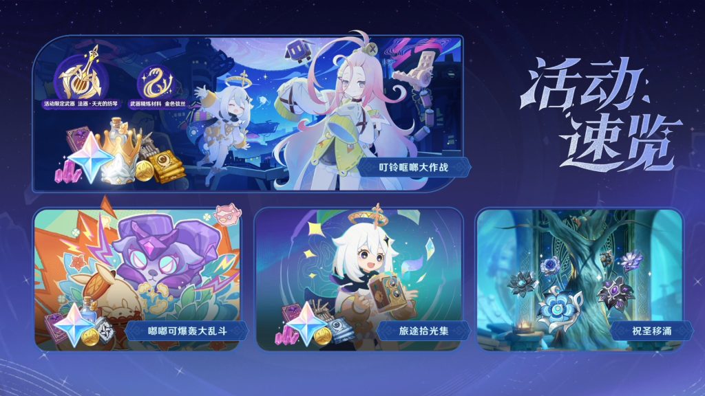 「月之一」版本也将更新「叮铃哐啷大作战」等一系列丰富多彩的活动。旅行者不仅可以和爱诺、伊涅芙一起,踏上一段和神秘机械有关的奇妙旅程,也可以完成轻松的打卡和对战等活动,获取原石、免费四星武器在内的丰富奖励。