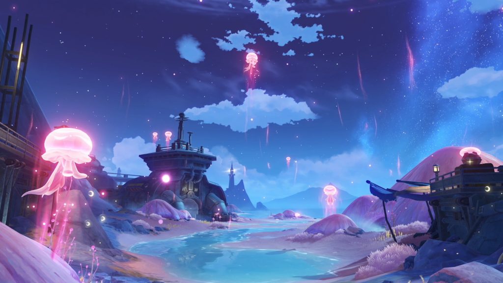 「挪德卡莱」作为至冬边疆的自治区域,笼罩在月亮的光芒之下。在探寻月亮秘密的旅途开端,旅行者将从纳塔启程,由海路前往挪德卡莱,到达这里的第一个目的地「那夏镇」。旅行者途中还会偶遇一只特别的月之生物「月灵」,借助月灵的力量不仅能完成某些特殊挑战,还能提升平常探索和跑图的效率。