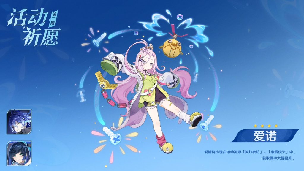 在版本第二期角色活动祈愿中,角色活动祈愿「孤灯夜访」将会开启,全新限定五星角色「诡灯陌影·菲林斯(雷)」将迎来概率UP,而限定五星角色「兰生幽谷·夜兰(水)」则在角色活动祈愿-2「素霓伣天」中迎来返场。全新四星角色「妙械咣咣铛·爱诺(水)」将出现在角色活动祈愿「孤灯夜访」、「素霓伣天」中,获取概率大幅提升。