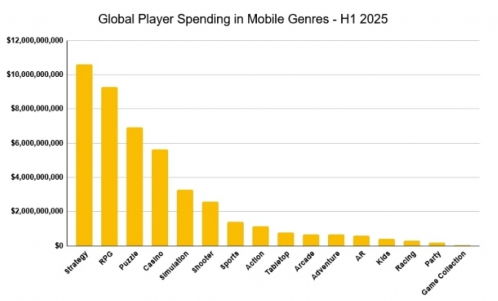 据AppMagic测算,2025年上半年,全球移动游戏市场的品类格局已有质变——策略以超过106亿美元的总收入超过RPG,成为全球收入规模最大的游戏品类,占比约24%。同比增速达到26%,排名第三。
