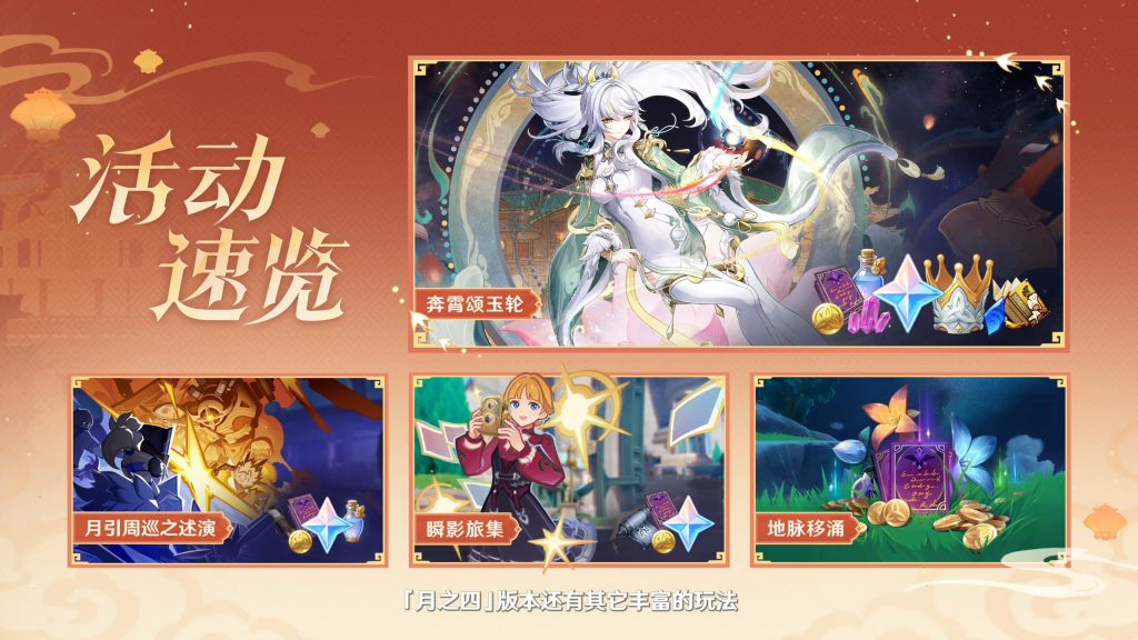 除海灯节活动之外,新版本也将更新「月引周巡之述演」、「瞬影旅集」、「地脉移涌」等阶段性活动,等待各位旅行者前去挑战,完成活动还可以获得原石等奖励。