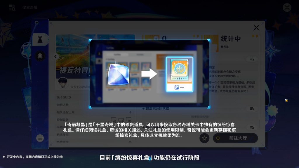 同时编辑器中将开放新的功能模块——「缤纷惊喜礼盒」。部分创作等级较高的奇匠可以设计自己的「缤纷惊喜礼盒」,并为其定义价格。购买了礼盒的玩家,将可以解锁更多的玩法体验。我们还将通过邮件为旅行者发放150枚用来购买礼盒的「奇丽凝晶」,参与版本活动还将再获得150枚「奇丽凝晶」,共计300枚。详细规则请关注后续的官方公告。